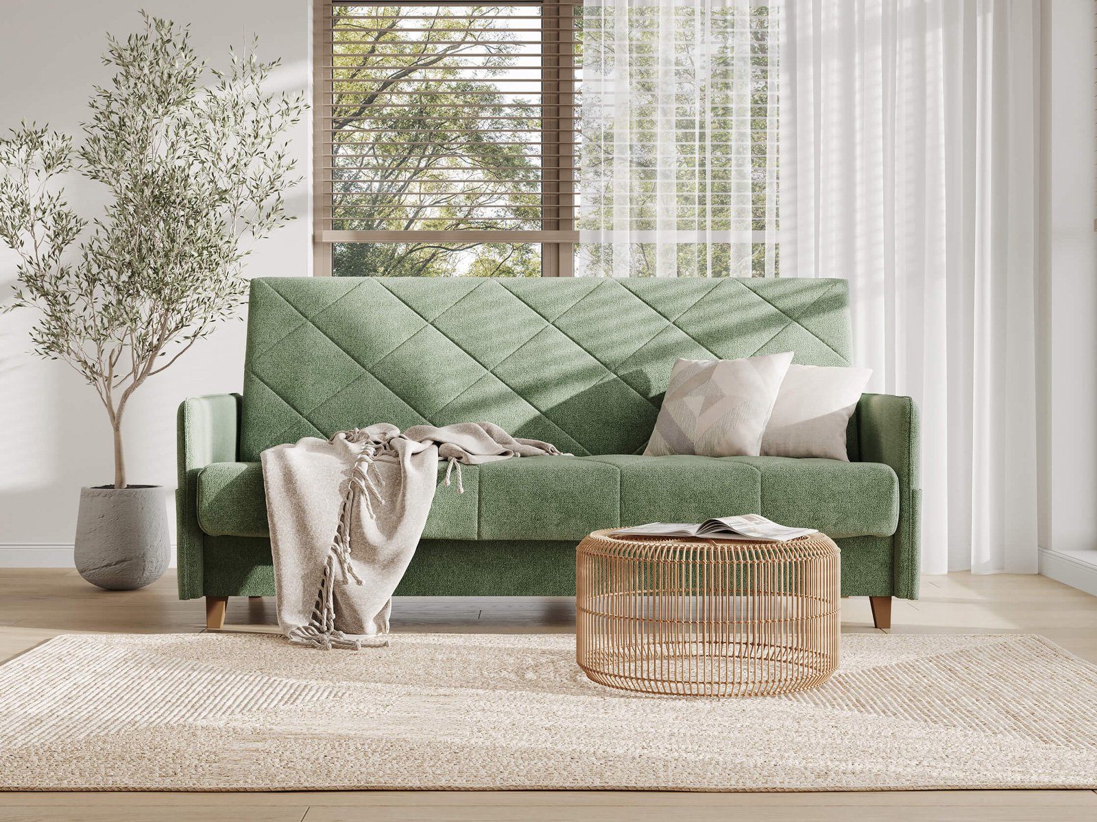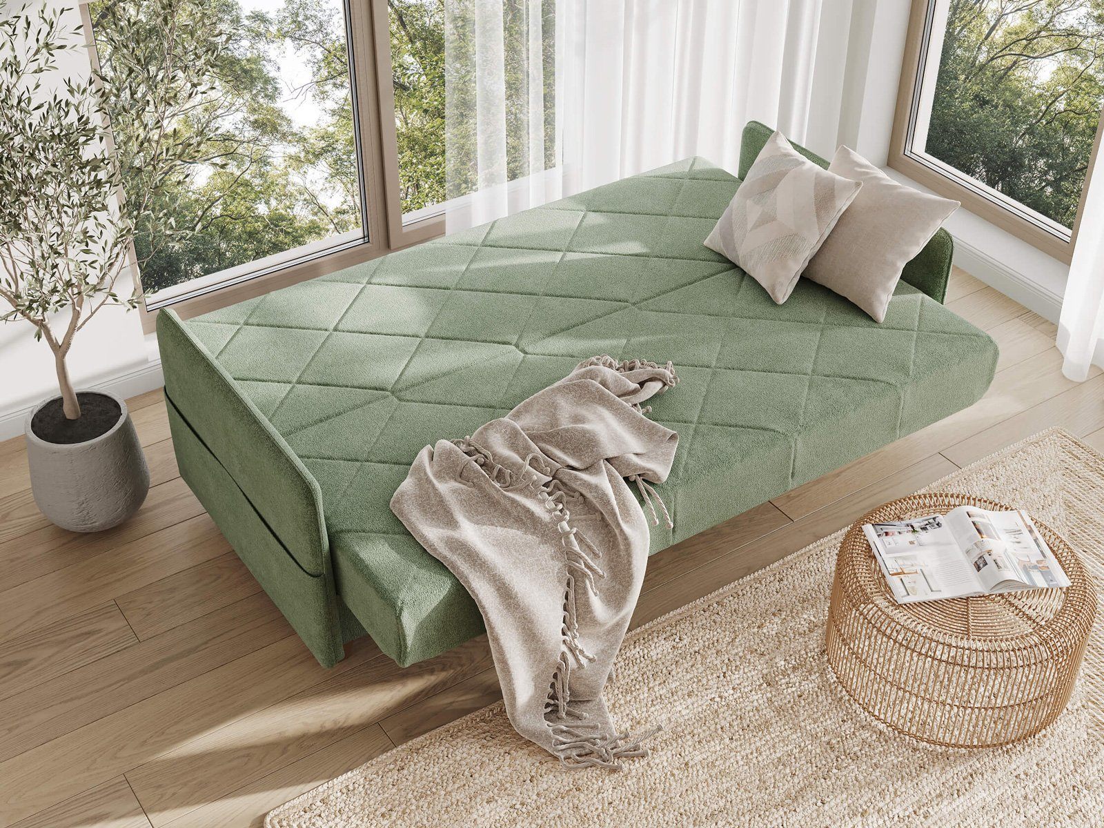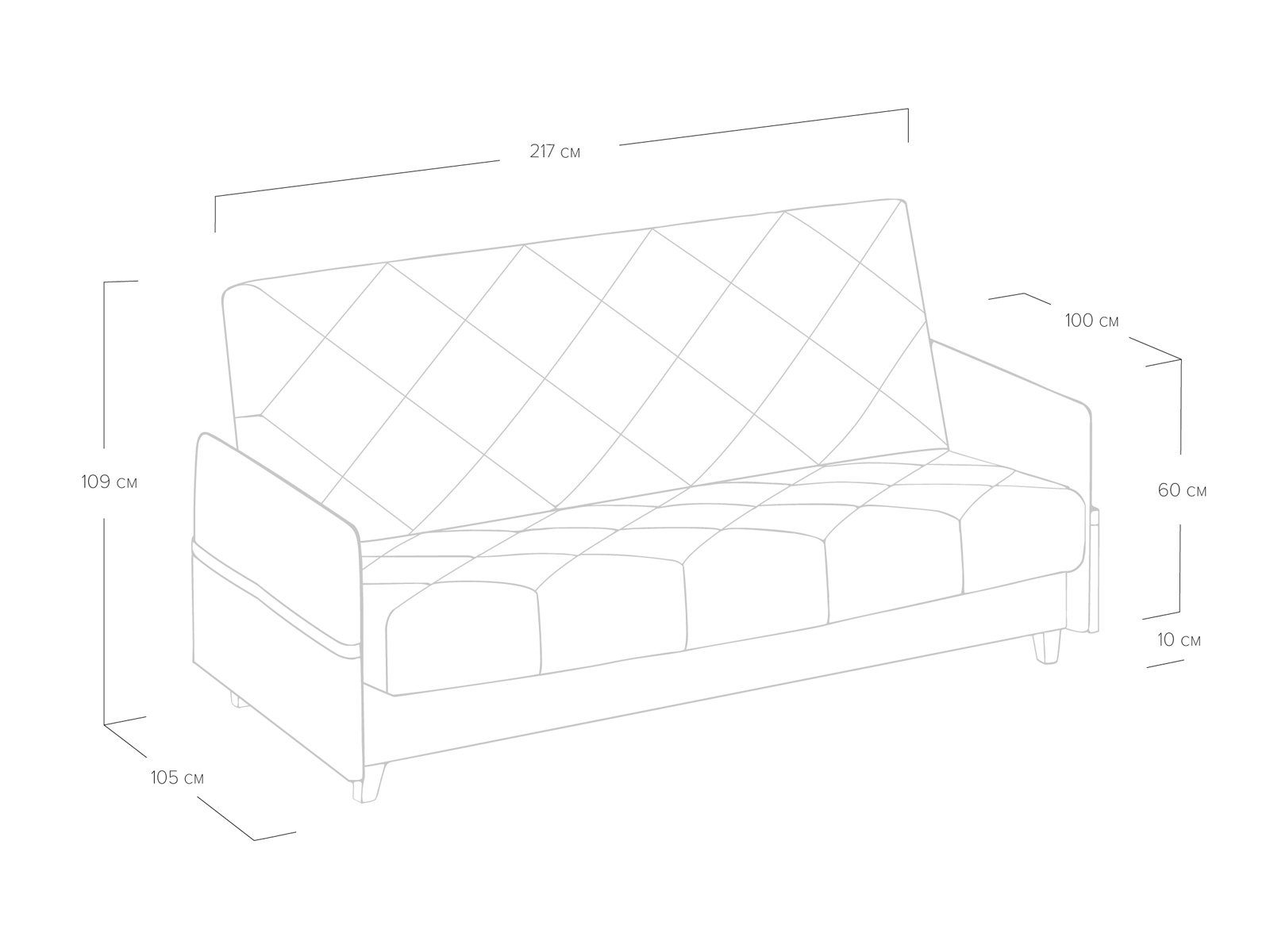 Диван для сна в скандинавском стиле с механизмом трансформации «клик-кляк» и коробом для хранения. Основание дивана металлическое, с ламелями. Матрас анатомический с независимым пружинным блоком. Благодаря съемному чехлу с объемной стежкой в форме ромбов, диван органично впишется в современные интерьеры в скандинавском стиле и стиле минимализм.