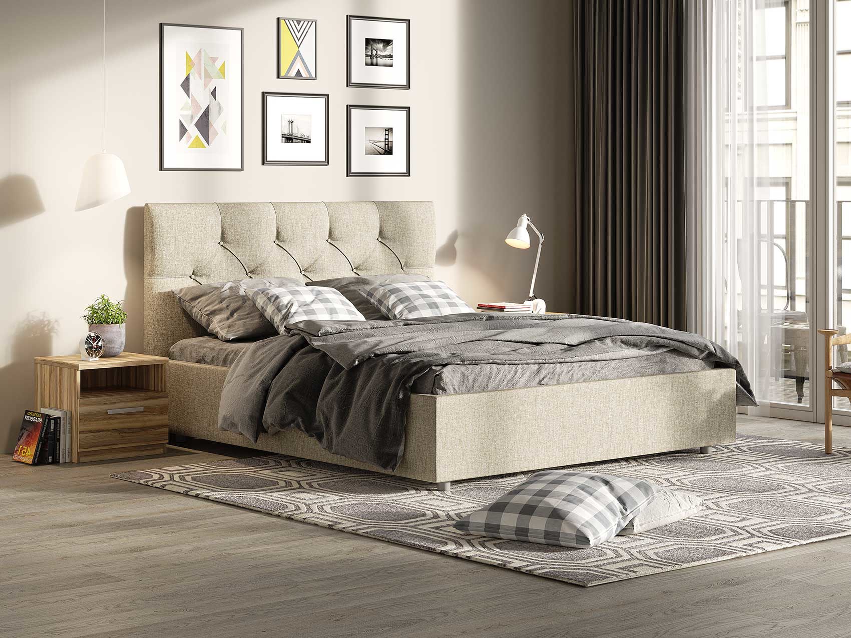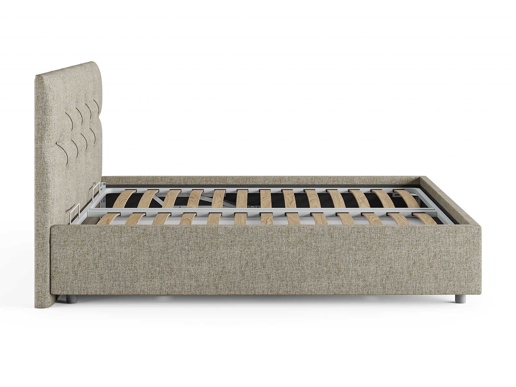 Кровать комплектуется металлическим основанием и подъемным механизмом со вместительным бельевым ящиком. Дно бельевого ящика легко сдвигается для обеспечения уборки под кроватью.