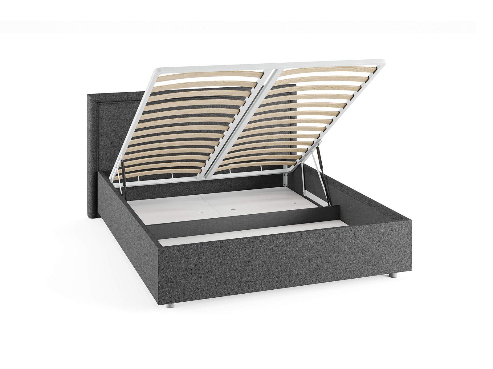 Кровать комплектуется металлическим основанием и подъемным механизмом со вместительным бельевым ящиком. Дно бельевого ящика легко сдвигается для обеспечения уборки под кроватью.