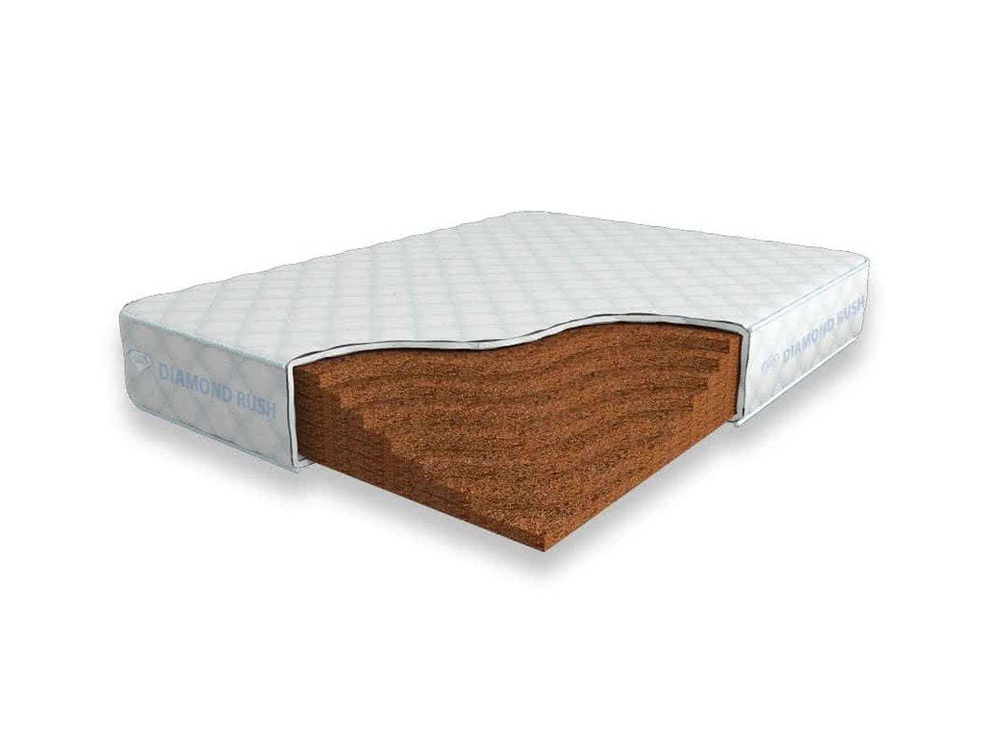 Матрас Diamond Rush Solid Cocos 21 DR является беспружинным, т.е. не имеет в своей основе пружинного блока. В его состав входят один или несколько слоев латексированной кокосовой койры. Это один из самых жестких материалов. Матрас, выполненный целиком из кокосовой койры, в меньшей степени обладает анатомическим эффектом.