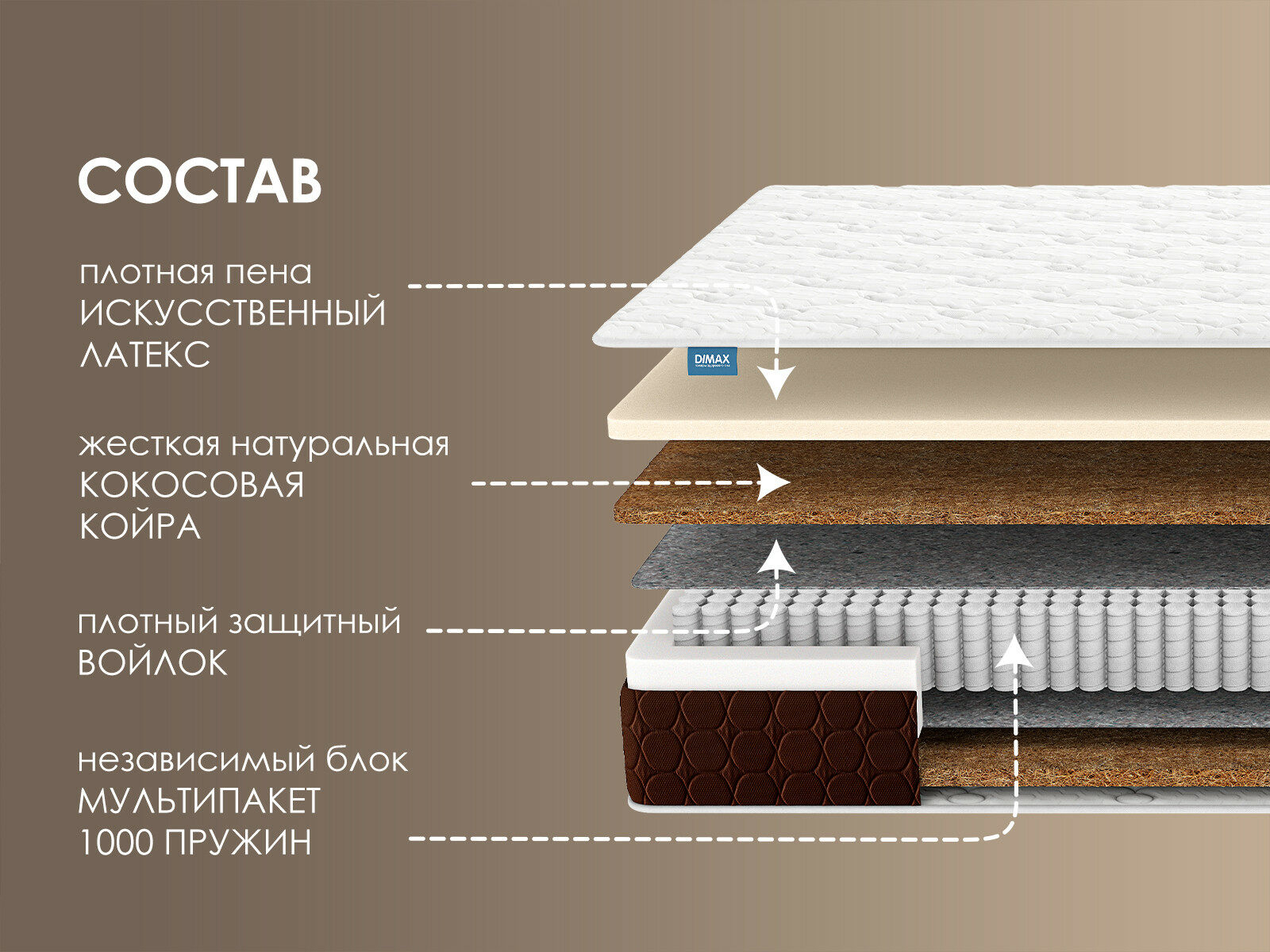 Димакс Мега Хард Медиум Плюс — матрас для тех, кто ищет эталонную поддержку позвоночника и мечтает о самом комфортном сне. Многоуровневая конструкция из усиленной кокосовой койры, искусственного латекса и блока S1000 создает «интеллектуальный каркас», который сочетает жесткость с адаптивностью, выдерживая до 150 кг нагрузки.
