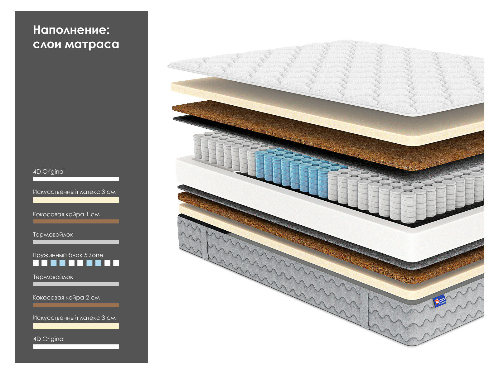 Модель идеально подходит для тех, кто ищет универсальное решение для обустройства спального места с выраженной ортопедической поддержкой. 5-зональный блок и наполнители — искусственный латекс и кокосовая койра — обеспечат высокий уровень комфорта и поддержки для здорового сна.