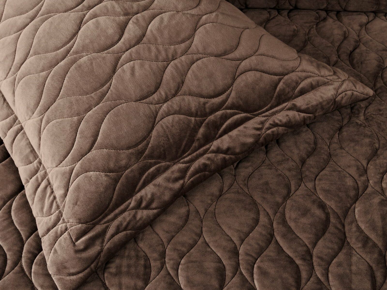 Покрывала и наволочки изготовлены из велюра высокой плотности - приятной на ощупь бархатистой ткани с коротким ворсом. Пошив покрывала с кантом, наволочки с ушками 5 см.