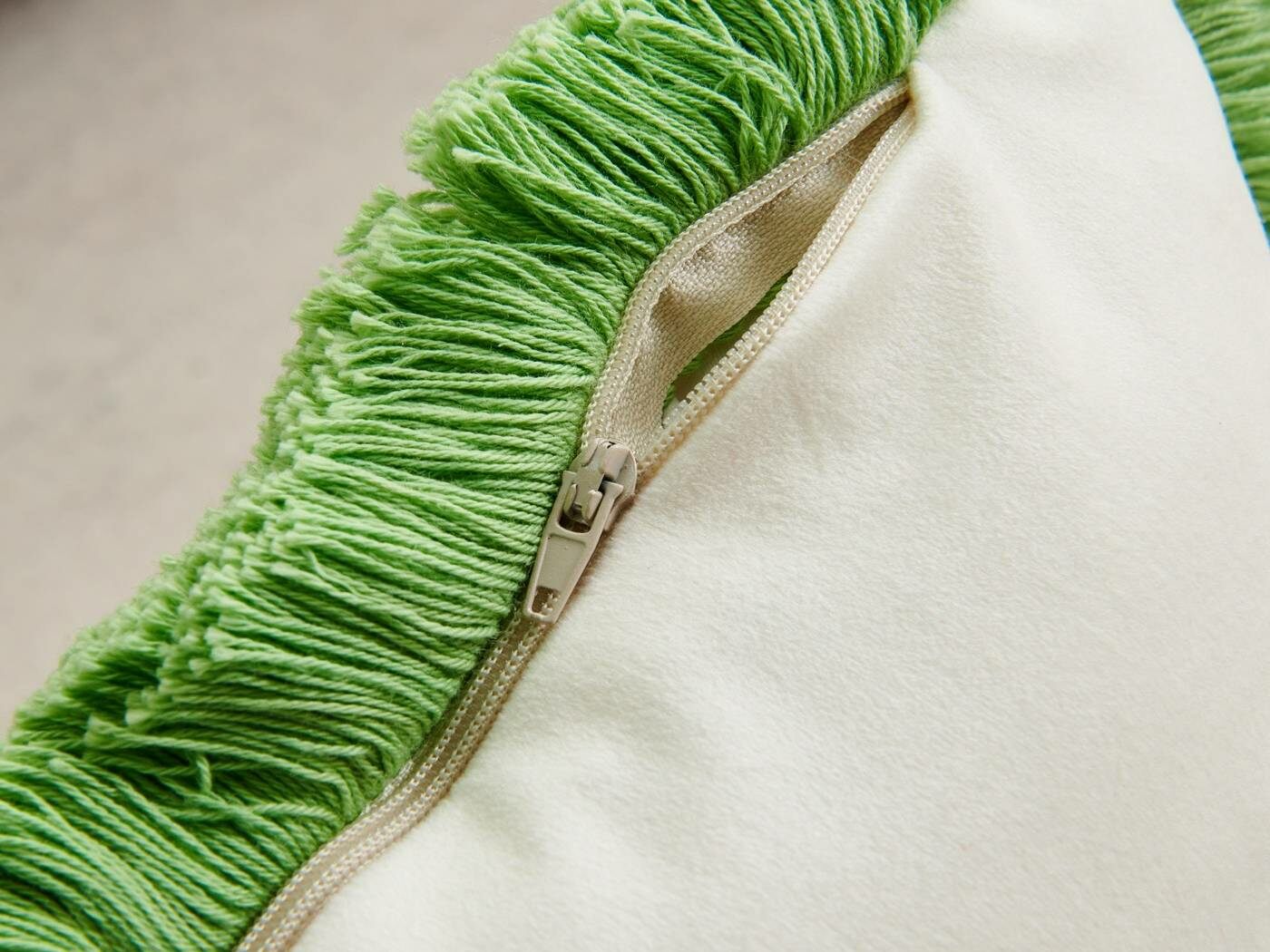 Особенность : с бахромой, потайная молния под цвет вшита в край наволочки.