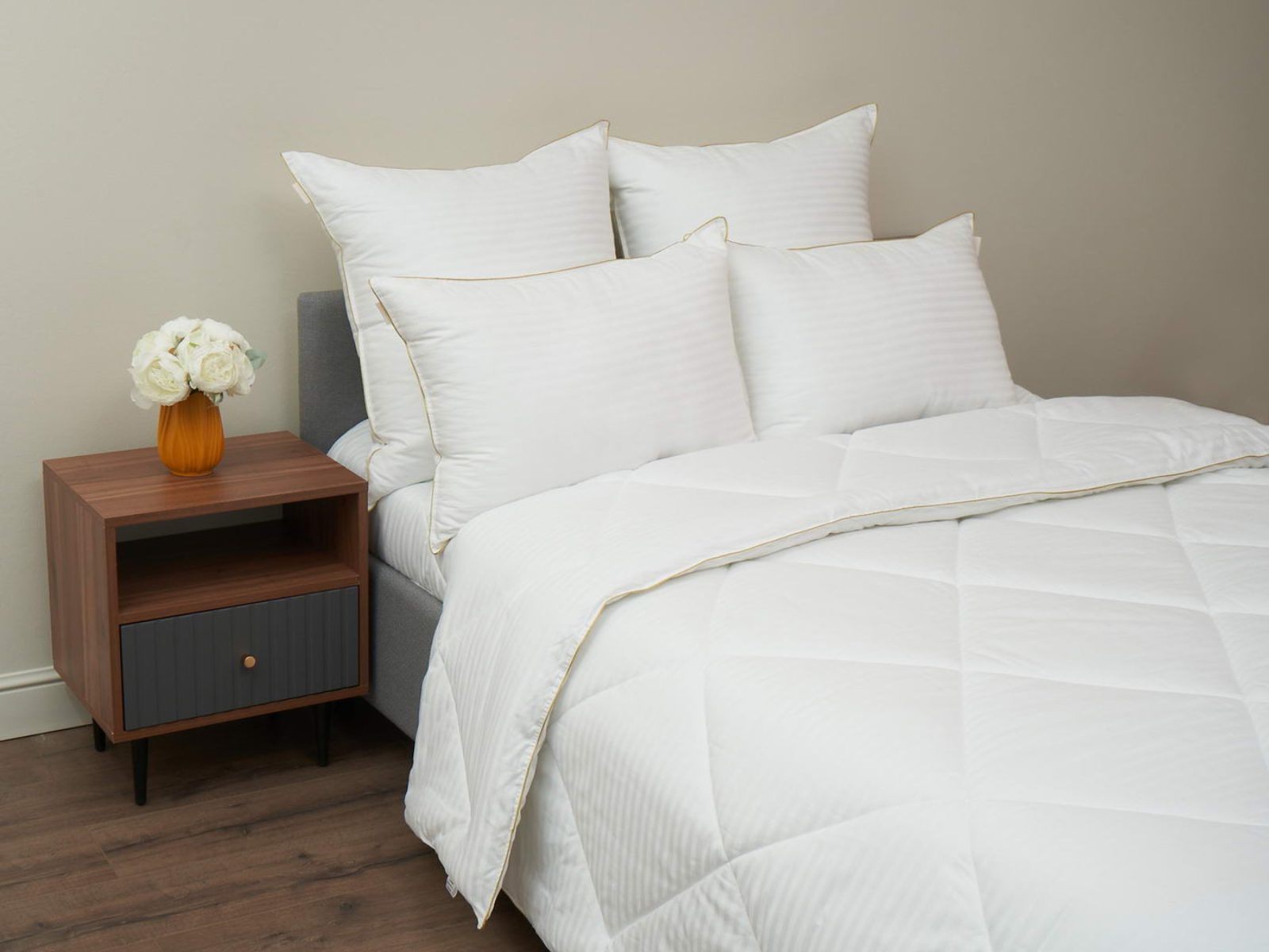 Подушки и одеяла SOFI изготовлены из ткани страйп-сатин. Эта ткань придает изделиям дополнительную гладкость и изящность из-за шелковистого блеска.