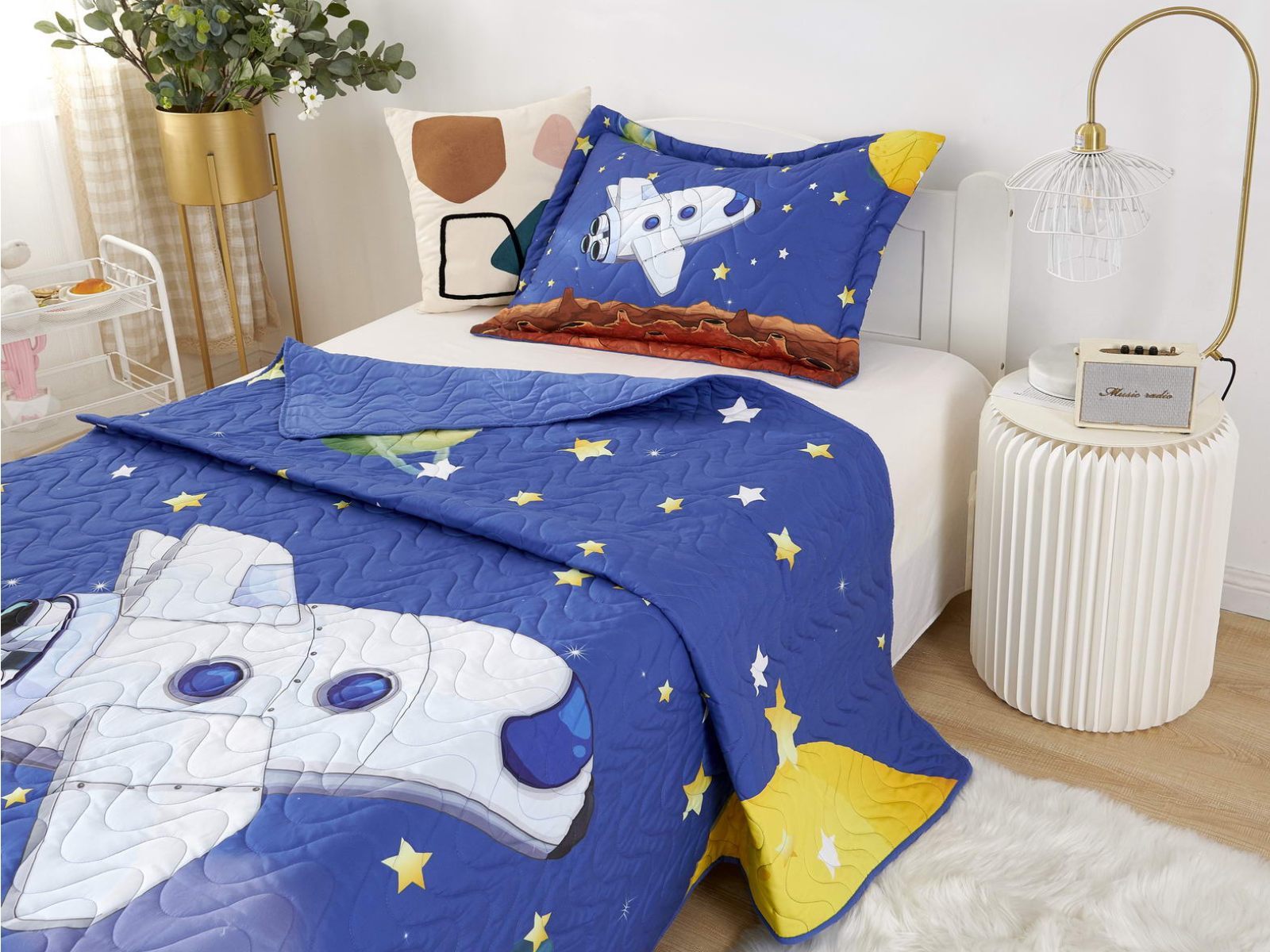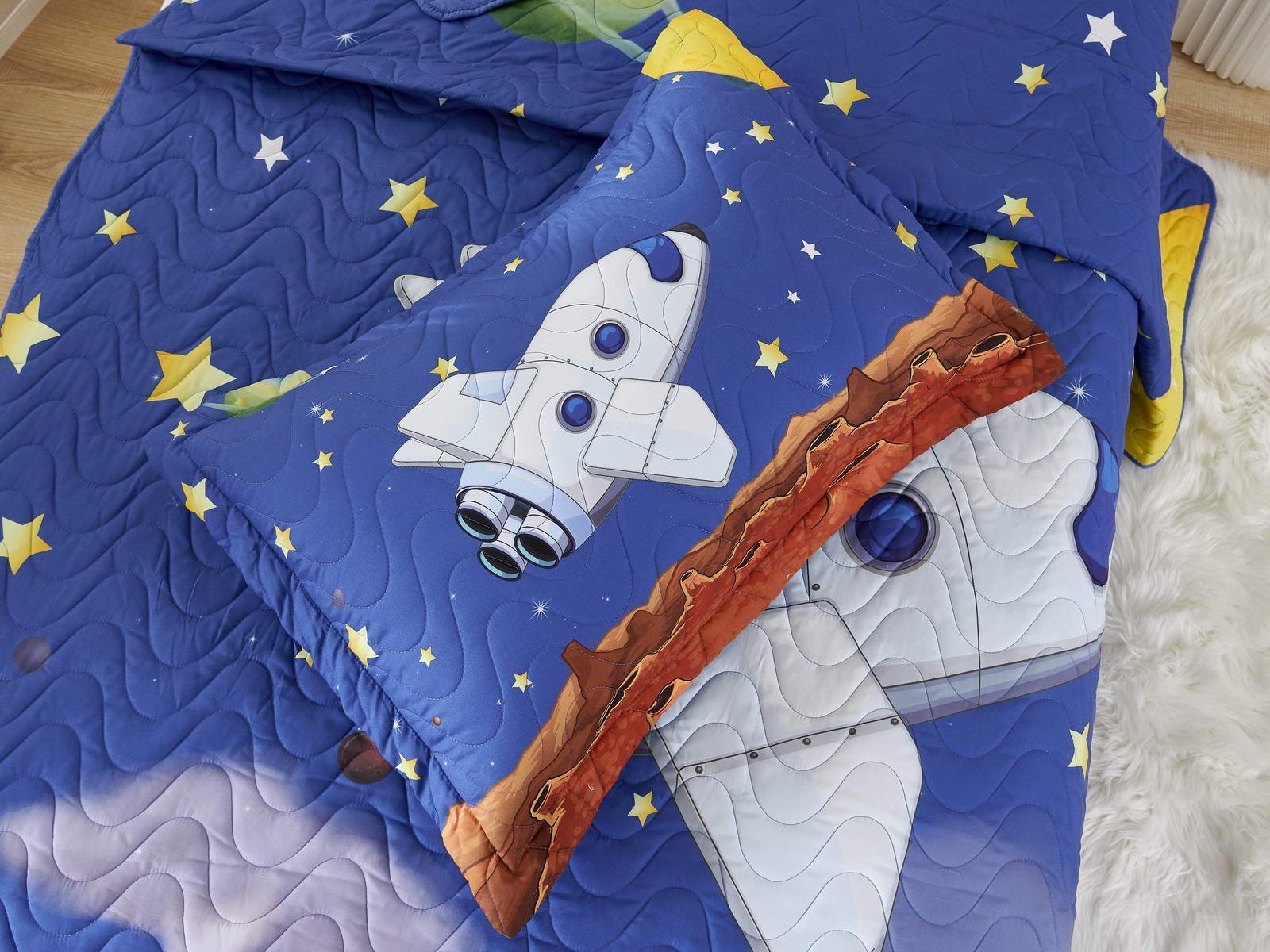 Детские покрывала - это особая забота об уюте и комфорте ребенка. Красивое, стеганое покрывало коллекции «Sunny day» придаст любой детской спальне яркую индивидуальность. Волнистые стежки делают изящные покрывала еще более выразительными и изящными. К ним в комплекте идут наволочки, у них есть интересная особенность, которая непременно понравится ребенку– небольшие ушки.